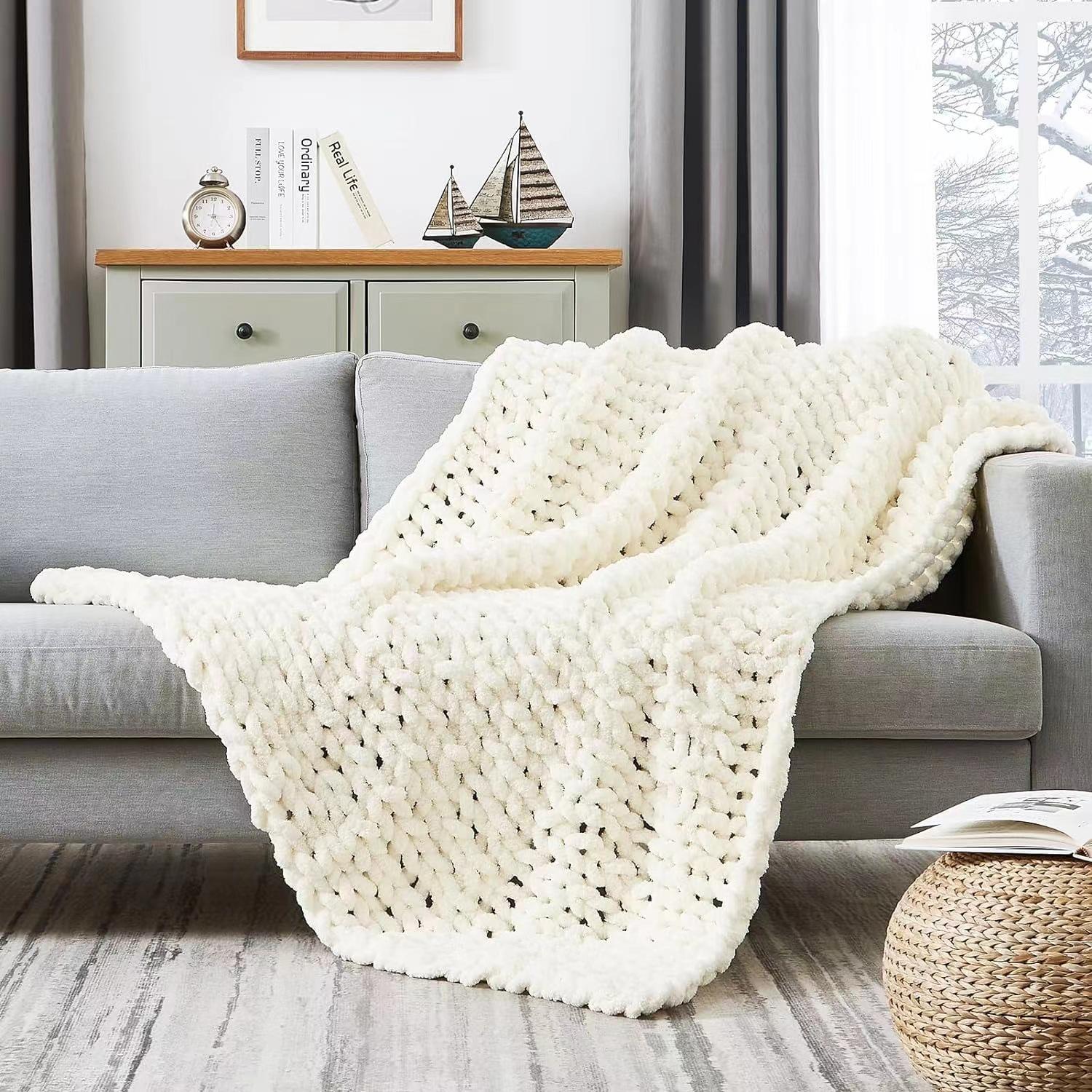 Strikket pledd 50 x 63 cm, Håndlaget stort lo-garn med løkker, Mykt pledd til sofa og seng, Stort heklet tykt vevd teppe