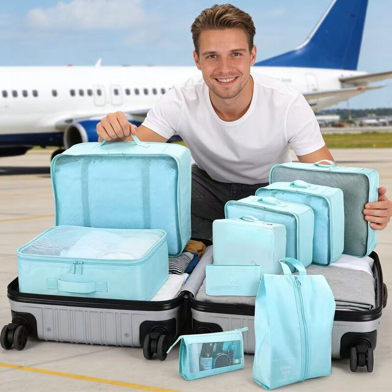 VoxorAI Sac de voyage bleu vif / Pochette de voyage / Sac de rangement pour vêtements / Trousse de toilette - Ensemble de rangement de voyage 8 pièces