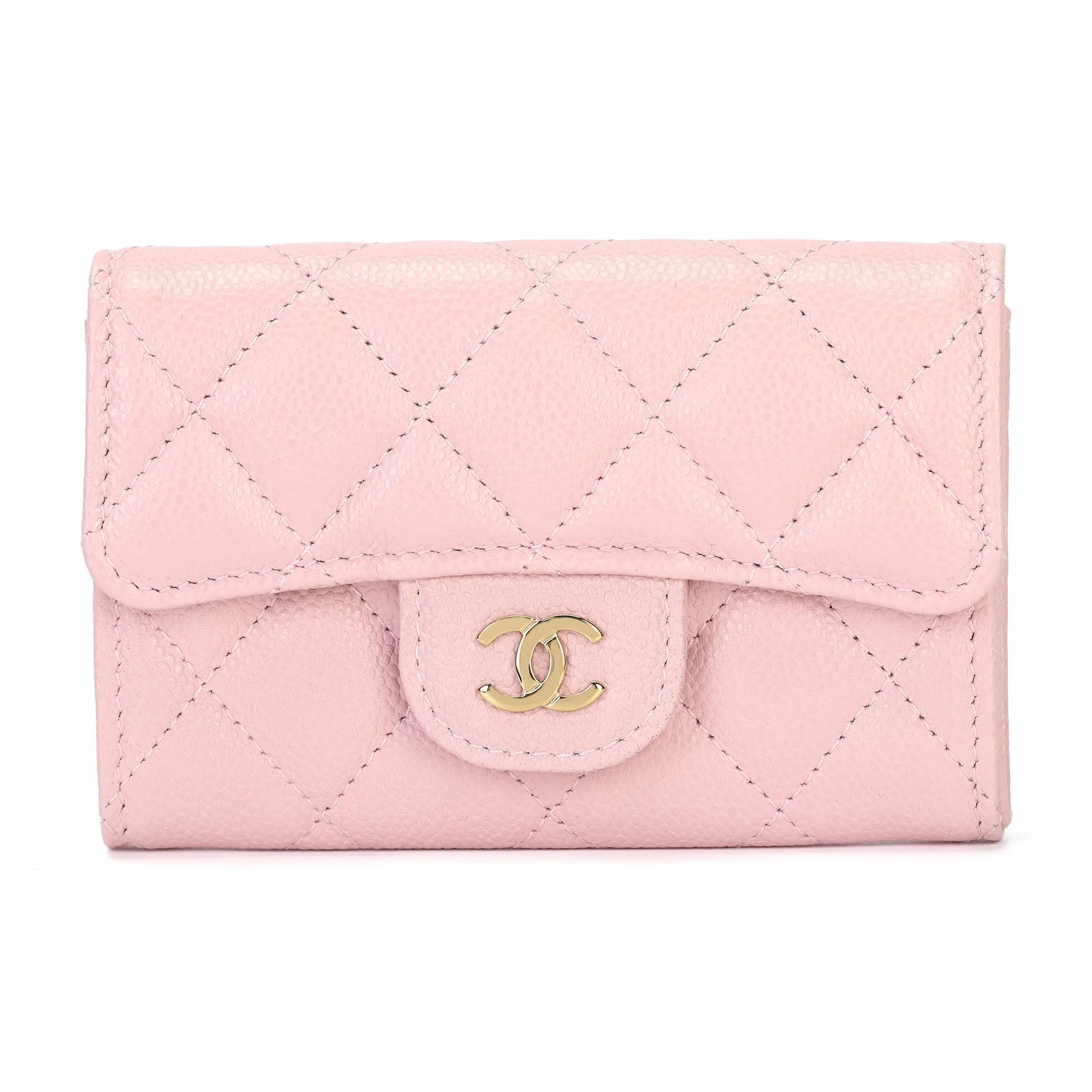 CHANEL 24K Klassisk Stil Vertikal Guldetikett Dubbel C-logotyp Vadderat Mönster Glänsande Korn Kalvskinn med Guldmetall Kortinnehavare för Kvinnor Ros