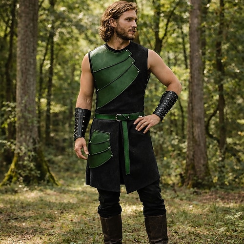 Set Retrò Vintage Medievale Rinascimento Gilet Cintura in Vita Tutore per polso con accessori Senza maniche Vichingo Ranger Costume Unisex Fantasia Halloween Carnevale Fiera Rinascimentale LARP Adulti