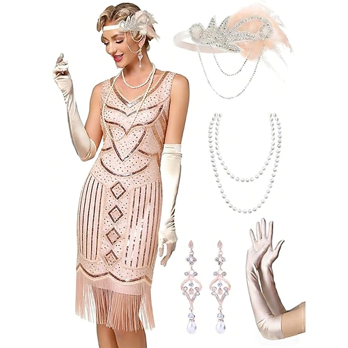 Set Anni Ruggenti Anni 1920 Abito Flapper Abito da cocktail con accessori Il grande Gatsby Ragazza Flapper Paillettes Frangia con nappe Frangia di nappa Con lustrini Costume Per donna Costume