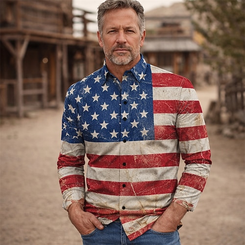 Americano 250 Retrò Vintage Anni '70 Camicia Camicia Aloha Lunghe Hippie Geometrico Etnico Costume Per uomo Mascherata 4 Luglio Feste Giorno dell'Indipendenza Semiquincentenario Adulti Camicia