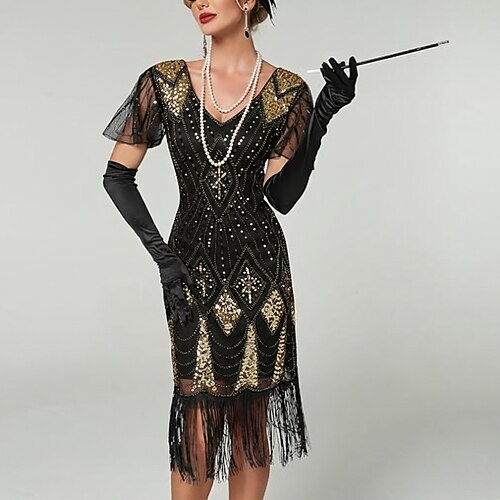 Retrò Vintage Anni Ruggenti Anni 1920 Lunghezza al ginocchio Abito Flapper Vestito Abiti Taglie Forti Maniche corte Il grande Gatsby Invitato al matrimonio Paillettes Frangia con nappe Scollo a V