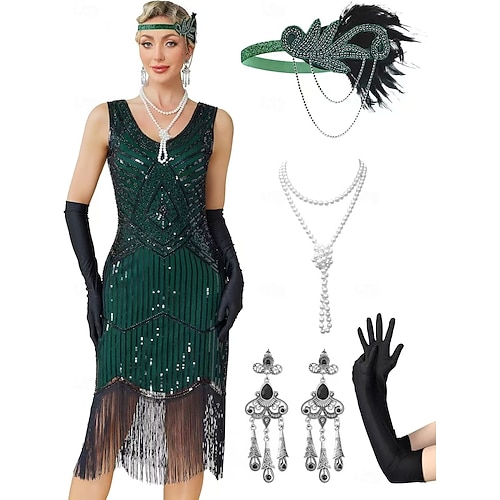 Set Anni Ruggenti Anni 1920 Abito Flapper Abito da cocktail con accessori Il grande Gatsby Ragazza Flapper Paillettes Frangia con nappe Frangia di nappa Con lustrini Costume Per donna Costume