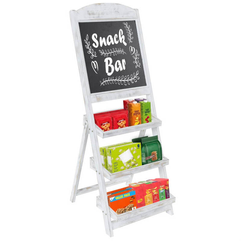MyGift Shabby Weißgewaschenes Holz Freistehende Kreidetafel Staffelei mit 3-stufigen Regalen, Dekoratives Kreidetafel-Pflanzenregal
