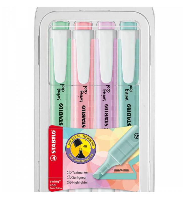 STABILO Swing Cool Pastel Étui en plastique de 4 surligneurs - 113, 116, 129 et 155