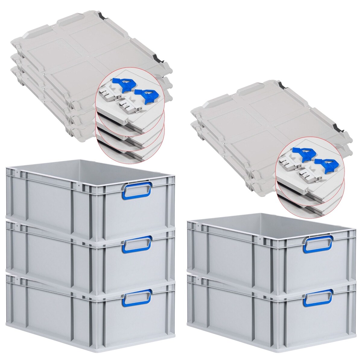 PROREGAL 5x Eurobox NextGen Grip mit Scharnierdeckel & blauen Verschlüssen | HxBxT 22x40x60cm | 44 Liter | Griffe geschlossen | Verstärkter Boden