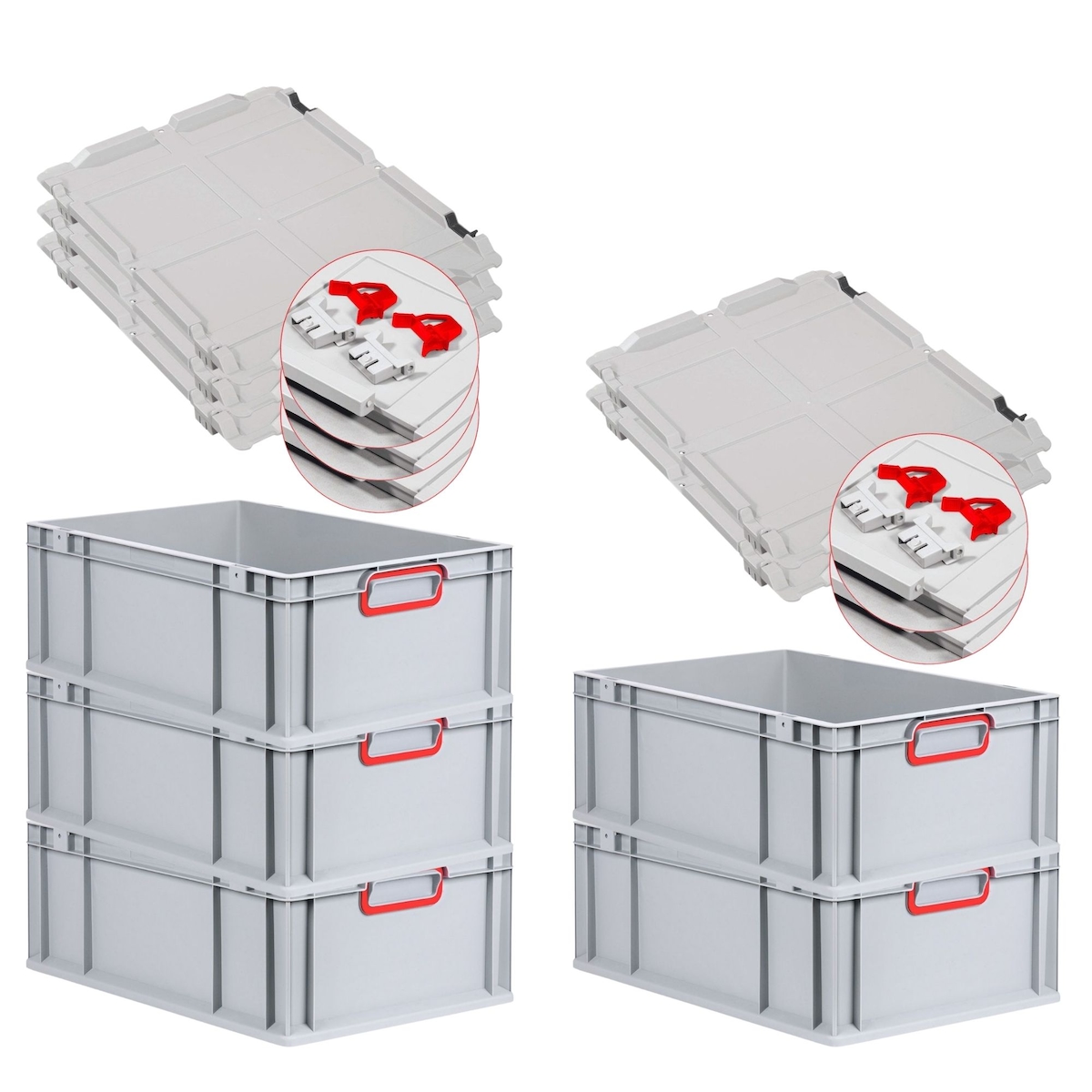 PROREGAL 5x Eurobox NextGen Color mit Scharnierdeckel & Verschlüssen | HxBxT 22x40x60cm | 44 Liter | Griffe rot geschlossen | Verstärkter Boden