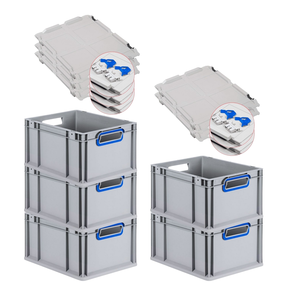 PROREGAL 5x Eurobox NextGen Grip mit Scharnierdeckel & blauen Verschlüssen | HxBxT 32x30x40cm | 30 Liter | Griffe offen | Glatter Boden