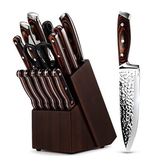 set di coltelli da chef autoaffilanti in acciaio inossidabile martellato con supporto in legno (15/16/20 pezzi) incluso coltello da bistecca, ideale regalo colorato per coltelli da cucina affilati