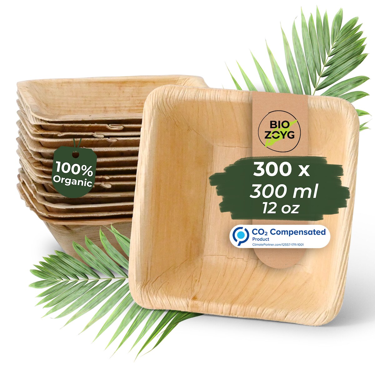 BIOZOYG 300 Stück quadratische Einwegschalen Palmblattschalen 300ml für Partys, umweltfreundliches Biogeschirr, Einmalgeschirr, biologisch abbaubar