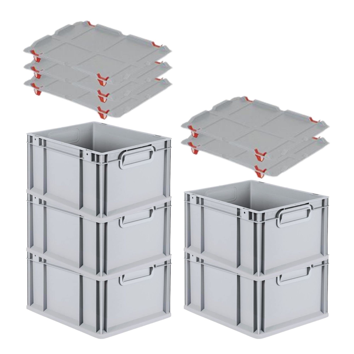 PROREGAL SparSet 5x Eurobox NextGen Economy mit Auflagedeckel & 4x Verschlüsse Rot, Griffe zu, HxBxT 32x30x40cm, 30L, Eurobehälter, Box