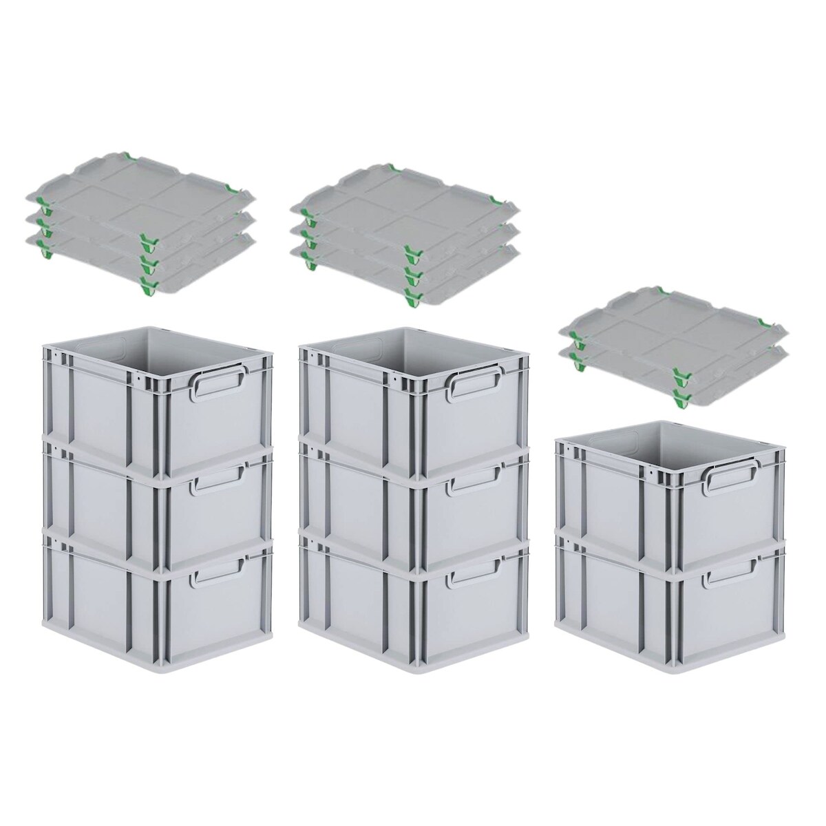 PROREGAL SuperSparSet 8x Eurobox NextGen Economy mit Auflagedeckel & 4x Verschlüsse Grün, Griffe zu, HxBxT 22x30x40cm, 20L, Eurobehälter, Box