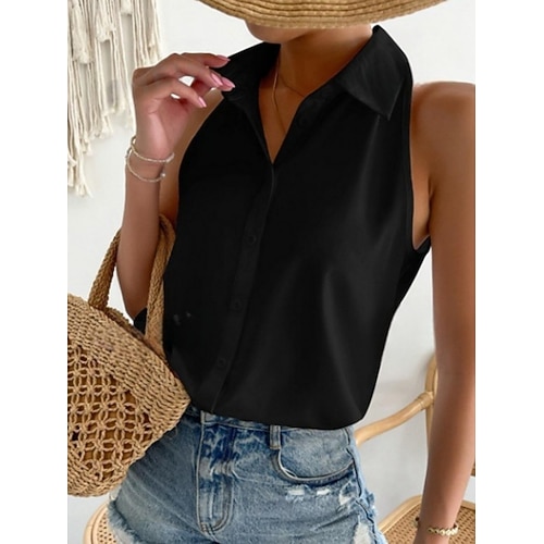 Per donna Camicia in raso Camicia con collo camp Arricciato Tinta unica Elegante Casual Senza Maniche Colletto a Camicia Top Regolari Quotidiano Nero Bianco Viola Arancione Verde Estate Primavera