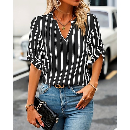 Per donna Camicia Camicia a righe Camicia casual A righe Elegante Classico Moderno Manica Lunga Scollo a V Top Regolari Quotidiano Ferie Uscire Blu Nero Bianco Estate Primavera