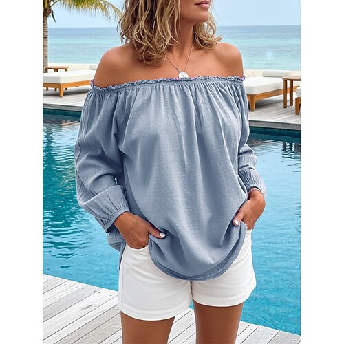Per donna Camicia Camicie di cotone e lino Camicia di lino Camicia da Spiaggia Volant Semplice Elegante Classico Moderno Manica Lunga Senza Spalle Top Regolari Quotidiano Ferie Abbigliamento mare Blu