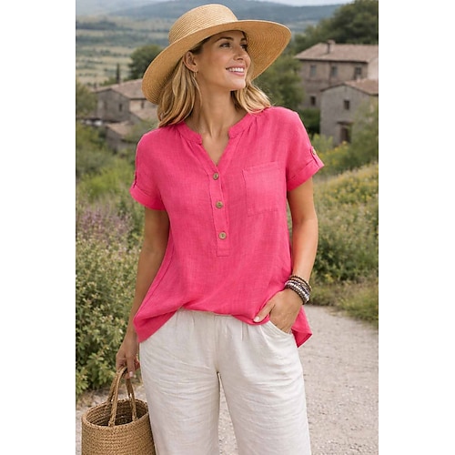 Per donna Camicia Camicie di cotone e lino Bottoni Semplice Quotidiano Elegante Essenziale Manica Corta Colletto a Camicia Top Regolari Quotidiano Lavoro Ferie Blu Rosa Rosa Estate
