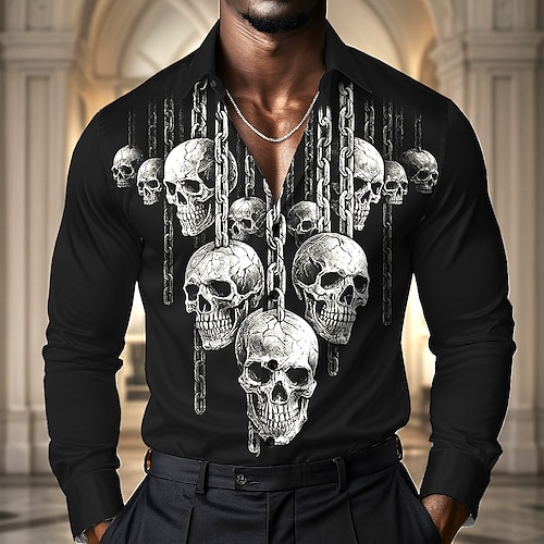 Per uomo Stampa di catene Teschi Camicia Camicia in raso Camicia elegante Manica Lunga Stile gotico oscuro All'aperto Ferie Estate Primavera Autunno Collo ripiegato Stampa 3D Camicie con bottoni Nero