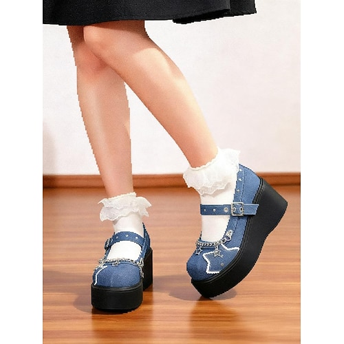 scarpe mary jane con plateau gotiche da donna: tacchi con plateau in denim nero con catene a stella e cinturini borchiati per feste di Halloween e look streetwear