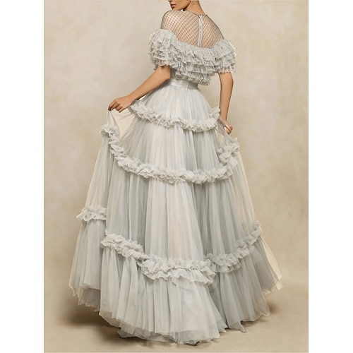 Linea ad A Lunghezza al pavimento Abiti da Ballo Elegante Manica Corta Collo gioiello Formale Tulle con Pieghe Volant