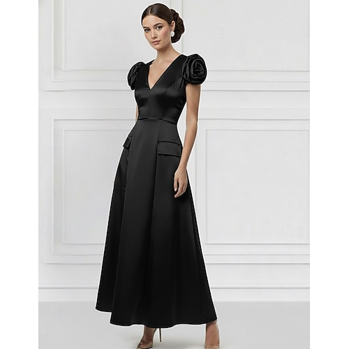 Linea ad A Lunghezza al pavimento Abito da Sera Elegante Manica Corta Scollo a V Matrimonio Formale Tasca Raso Elasticizzato con Fiore sulla Spalla