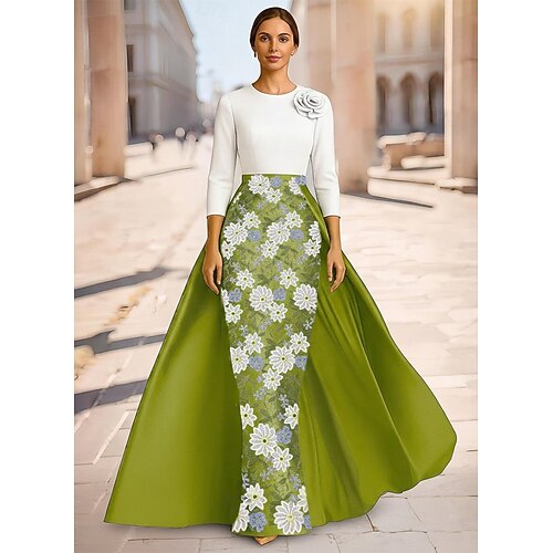 Linea ad A Sirena Tromba Lunghezza al pavimento Abito da Sera Abito da ballo con sopragonna Abito formale Elegante Manica 3/4 Girocollo Festa in giardino Matrimonio Raso Elasticizzato con Fiori 3D