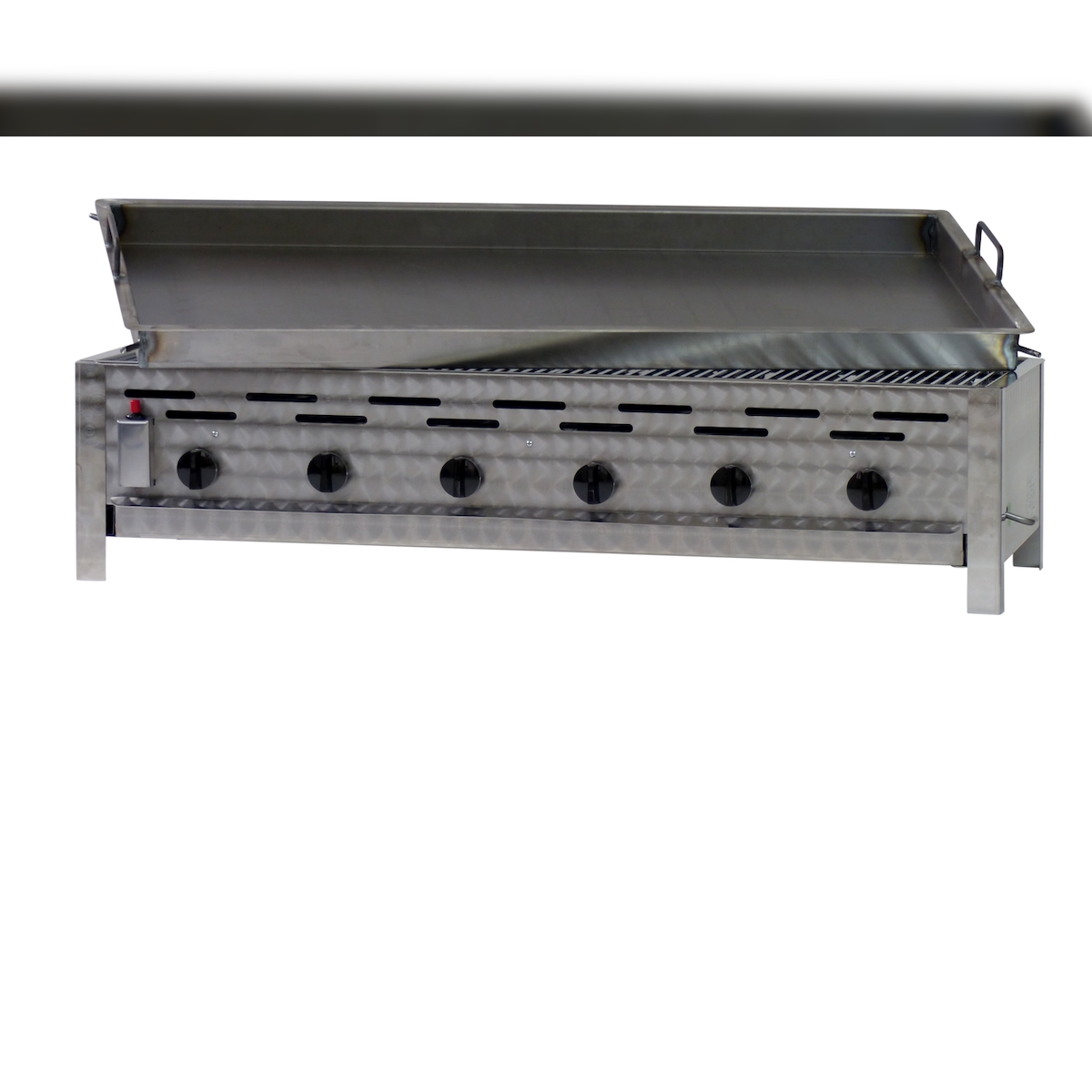 Gastrobräter, 6 Brenner je 4,5 kW, m. Grillrost u. Edelstahlpfanne geschw., B 1140x T 530x H 270mm, inkl. Gewerbedruckregler u. Schlauchbruchsicherung