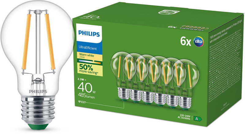 Philips UltraEfficient LED lamp Transparant - 40W - E27 fitting - Warmwit licht; 2700K - Ultra Efficiënt: Energielabel A - 6-pack