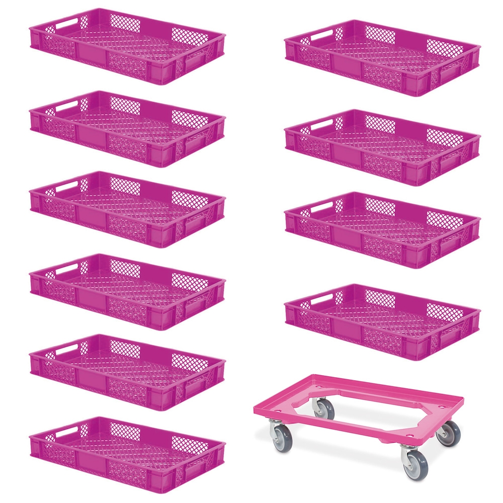 BRB 10x Eurobehälter, LxBxH 600x400x90 mm, lebensmittelecht + 1 Transportroller, pink