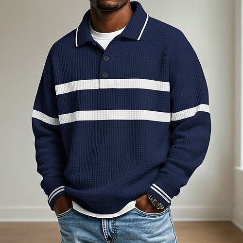 Per uomo A righe Magliette Polo a Nido d'Ape Polo da rugby Manica Lunga Magliette polo Camicie con Colletto Casual Athleisure Abbigliamento quotidiano Bottoni Primavera Autunno Inverno Blu Bianco