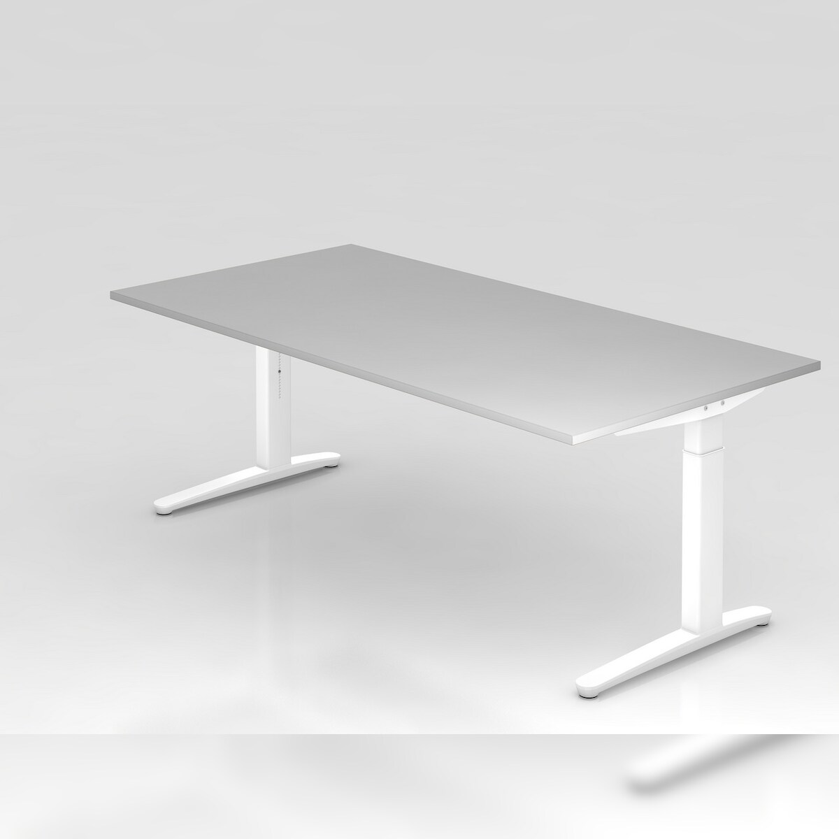 PROREGAL Schreibtisch Mika | Weiß | Graues Gestell poliert | BxT 200x100cm | Arbeitshöhe 65-85cm | höhenjustierbar, 1cm Raster | C-Fuß-Gestell