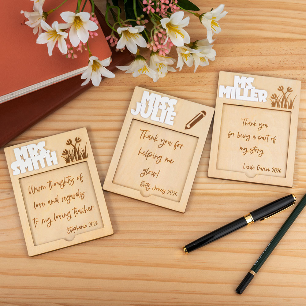 Set di porta note appiccicose in legno 3D personalizzate con nome e testo incisi Regalo di fine anno di apprezzamento per l'insegnante