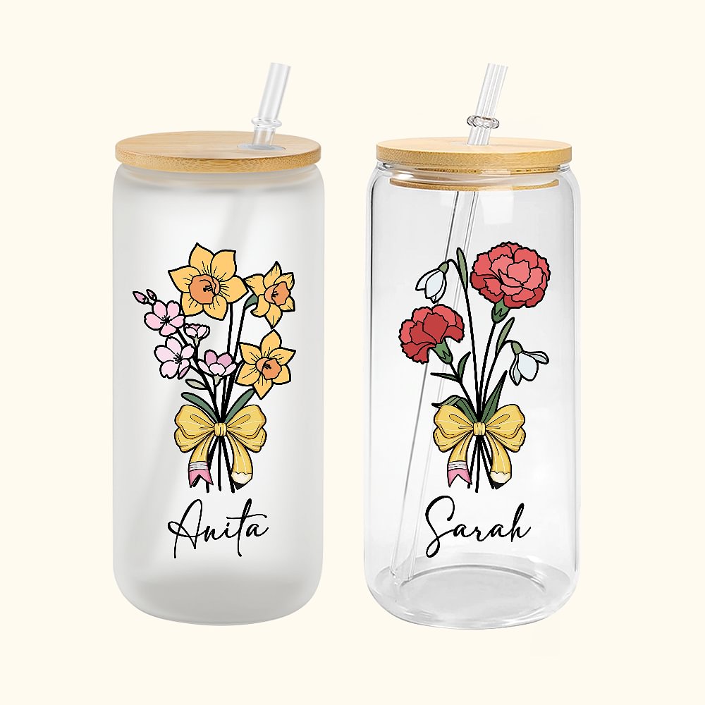 Personlig födelseblombukett Pennbåge 20oz namn ölburkglas med bambulock och sugrör Födelsedag Uppskattning Present till lärare