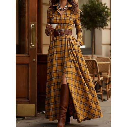Per donna Abito maxi Abito a Tubino Vacanza Casual Boho Quotidiano Vestibilità regolare Plaid Manica Lunga Colletto a Camicia Blu Giallo Rosa Rosso Primavera Autunno Inverno