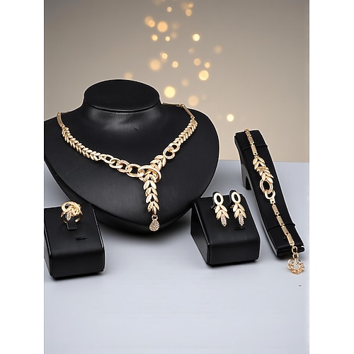 set di gioielli da donna con catena in oro - elegante set composto da quattro pezzi con collana, bracciale, orecchini e anello con motivo a foglia per feste, balli serali o occasioni formali