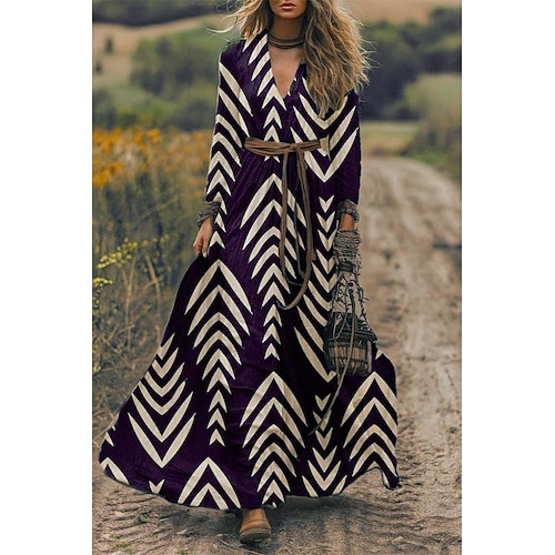 Per donna Abito maxi Abito a trapezio Abito Pieghettato Abito aderente e svasato Boho Data Uscire Vestibilità comoda Floreale Grafico Manica Lunga Scollo a V Viola Marrone Verde Primavera Autunno