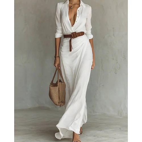 Per donna Abito Lungo Maxi Abito Abito Camicia Moderno Quotidiano All'aperto Uscire Vestibilità regolare Semplice Manica Lunga Colletto a Camicia Nero Bianco Blu marino Cachi Primavera Autunno