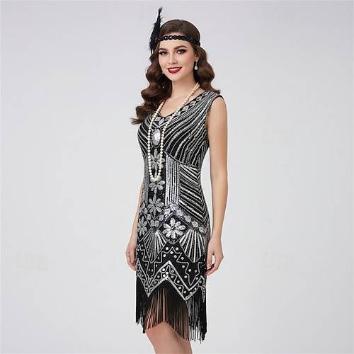 Retrò Vintage Anni Ruggenti Anni 1920 Lunghezza al ginocchio Abito Flapper Vestito Abiti Senza maniche Il grande Gatsby Invitato al matrimonio Paillettes Frangia con nappe Scollo a V Costume Per donna