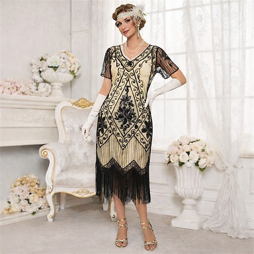 Retrò Vintage Anni Ruggenti Anni 1920 Lunghezza al ginocchio Abito Flapper Vestito Abiti Maniche corte Il grande Gatsby Invitato al matrimonio Paillettes Frangia con nappe Scollo a V Costume Per donna