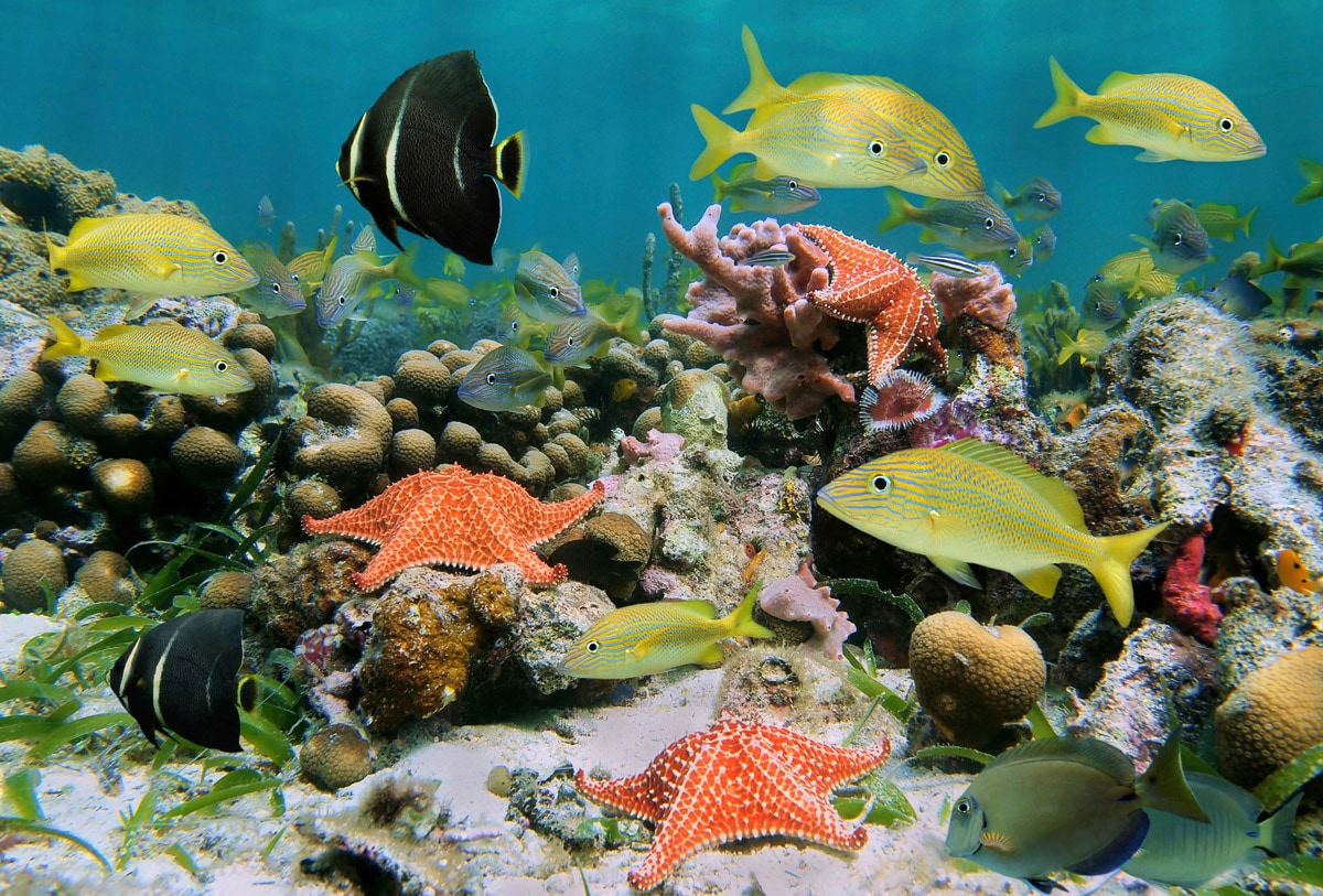 Fototapete PAPERMOON "Fische mit Seesternen", bunt, B:5,00m L:2,80m, Vlies, Tapeten