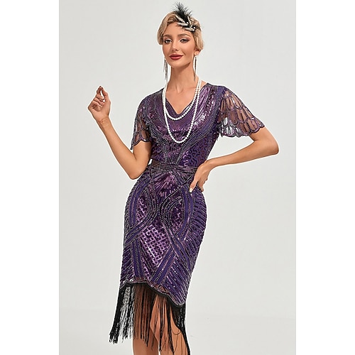 Retrò Vintage Anni Ruggenti Anni 1920 Lunghezza al ginocchio Abito Flapper Vestito Maniche corte Il grande Gatsby Invitato al matrimonio Paillettes Frangia con nappe Scollo a V Costume Per donna
