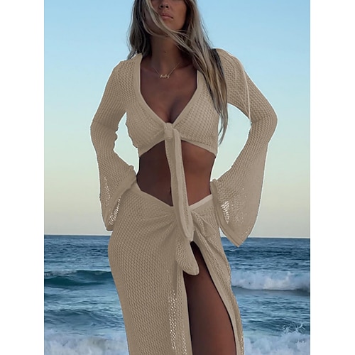 Costume da bagno coprente a due pezzi da donna Maglina Vacanza Mare Abbigliamento Colore Unito Collo a V Maniche Lunghe