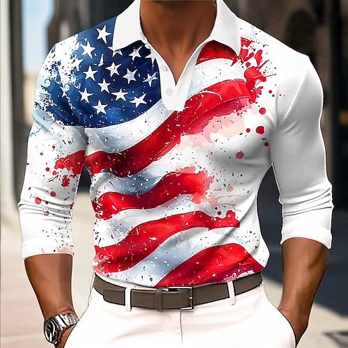Giorno dell'Indipendenza Americana Per uomo Bandiera Americana Polo Manica Lunga Magliette polo Bavero Casual All'aperto Abbigliamento quotidiano Abito da festa Stampa 3D Bottoni Primavera Blu Blu 1