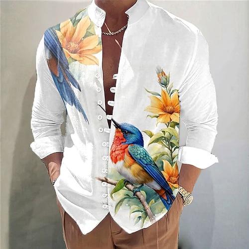 Per uomo Uccello Stampa Floreale Fiore Camicia Camicia di lino Camicia Aloha Manica Lunga Casual Vacanza Abbigliamento quotidiano Uscire Primavera Colletto Mao Bottonato Giallo Rosa