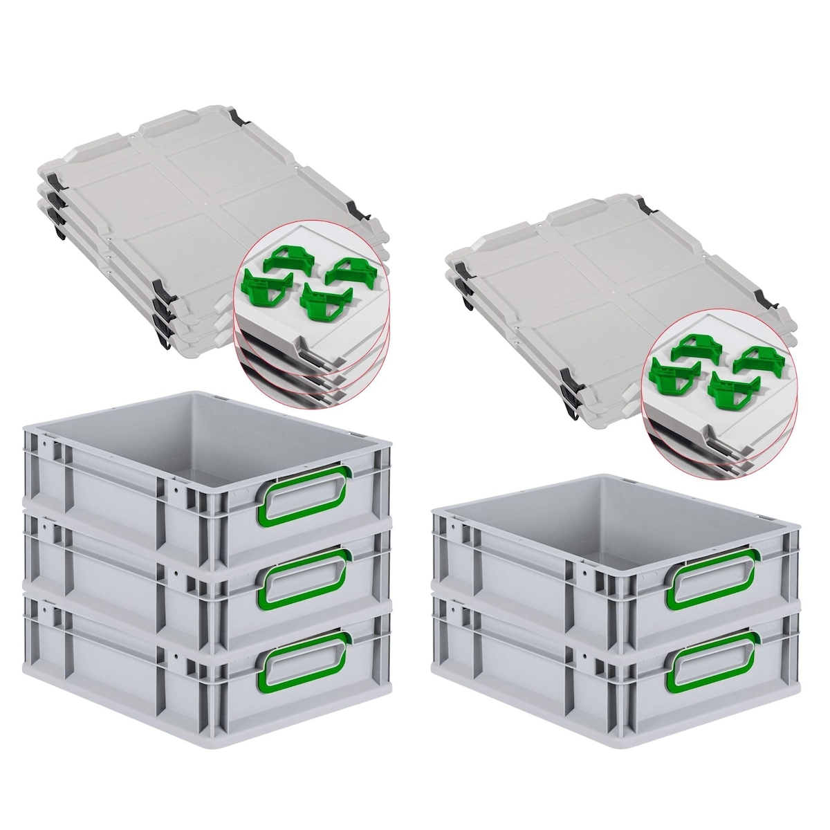 PROREGAL SparSet 5x Eurobox NextGen Color mit Auflagedeckel & Verschlüsse, HxBxT 12x30x40cm, 11L, Grau, Griffe grün zu, Eurobehälter, Box