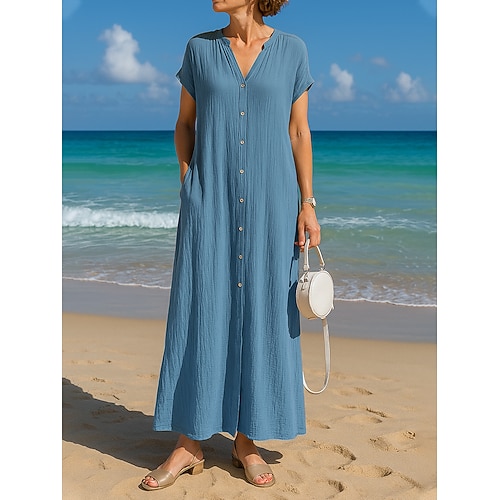 Per donna Abito Lungo Maxi Abito 100% lino Abiti in cotone e lino Abito in lino Abito Camicia Essenziale Casual Casuale Quotidiano Vacanza Vestibilità comoda Semplice Mezza Manica Colletto a Camicia