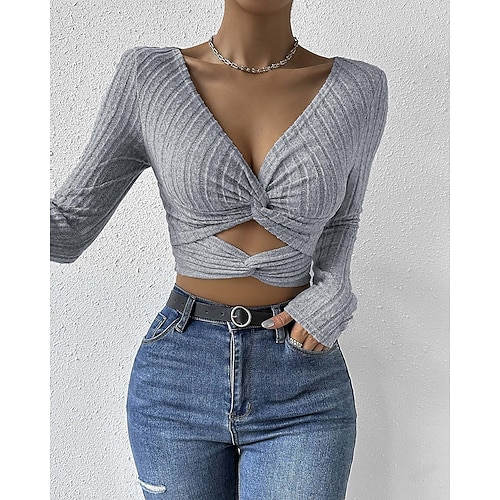 Per donna Top traforato Top attillati Tinta unica Sport Elegante Sexy Manica Lunga Scollo a V Quotidiano Ferie Uscire Taglio Grigio Primavera Autunno