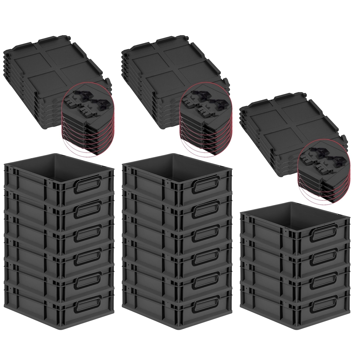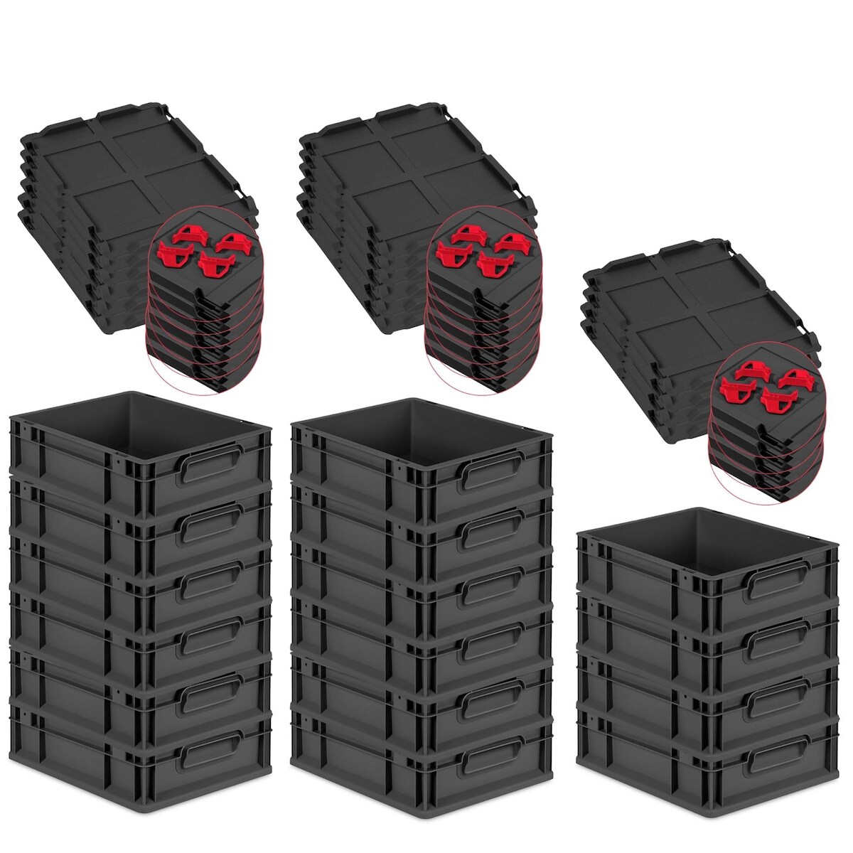 PROREGAL SuperSparSet 16x Eurobox NextGen Grip mit Auflagedeckel & 4 roten Verschlüssen, HxBxT 12x30x40cm, 11L, Schwarz, Griffe zu, Eurobehälter