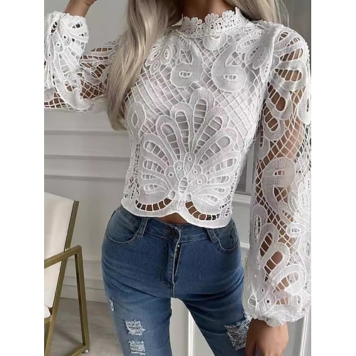 Per donna Blusa Tinta unica Elegante Essenziale Casual Manica Lunga Collo Alto Top Regolari Quotidiano Pizzo Patchwork Bianco Estate Primavera Autunno