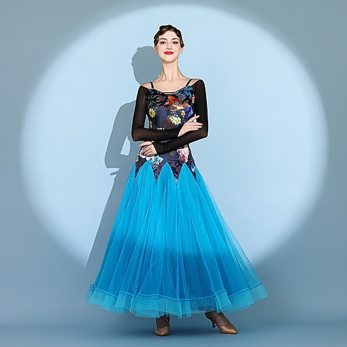 abito da ballo da sala floreale da donna con spalle scoperte, colletto a balze, abito da valzer a maniche lunghe, blu e bianco, abito da competizione moderno standard
